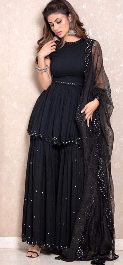 Buy Aru Women S Georgette Mouni Roy Style Sharara Set Black Xx Large At Amazon In - Mouni roy black faux georgette designer kameez style lehenga.